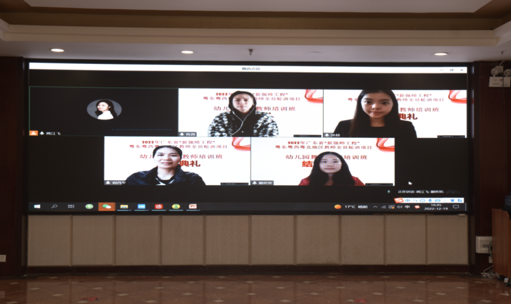 12月20日,由学前教育学院承办的2022年广东省粤东粤西粤北地区全员轮训项目幼儿园舞蹈骨干教师培训班结业典礼在茂名市荔晶大酒店吉祥厅举行,为期十二天的集中培训圆满结束,来自粤东粤西粤北的50名学员顺利结业。舞美教研室的专家老师线上出席了结业典礼。项目负责人谢琼教授带领团队老师参加了现场结业典礼。
