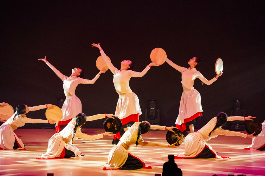 由三位指导教师历时半年精心创排的原创女子群舞《漆之艺》,取材于古代海上丝绸之路中转港广东阳江地区流传数百年的油漆技艺。作为国家级非遗项目,阳江漆艺以深秀、含蓄、神秘的个性,彰显着悠久的历史传统和鲜明的地域特征。舞蹈作品旨在将中国古典舞动作语汇与漆艺制作中最具特色的动作加以锤炼,再现出当年技艺制作与沿着海上丝绸之路远销世界各地的辉煌场面,以此呼吁人们关注传统技艺的保护与传承。中华民族伟大复兴的大国工匠精神在经典的节拍韵律与舞姿交汇相融合中缓缓展现。