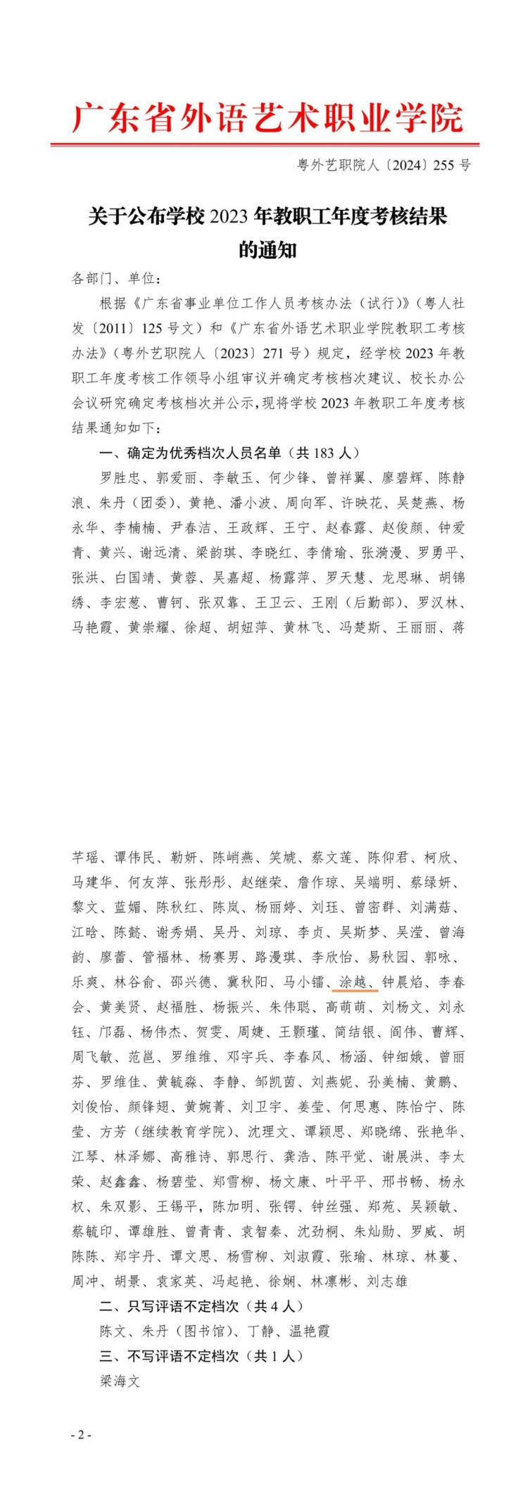 图为涂越老师获2023年教职工年度考核优秀佐证