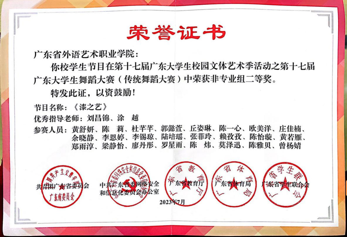 图为原创舞蹈作品《漆之艺》获奖证书